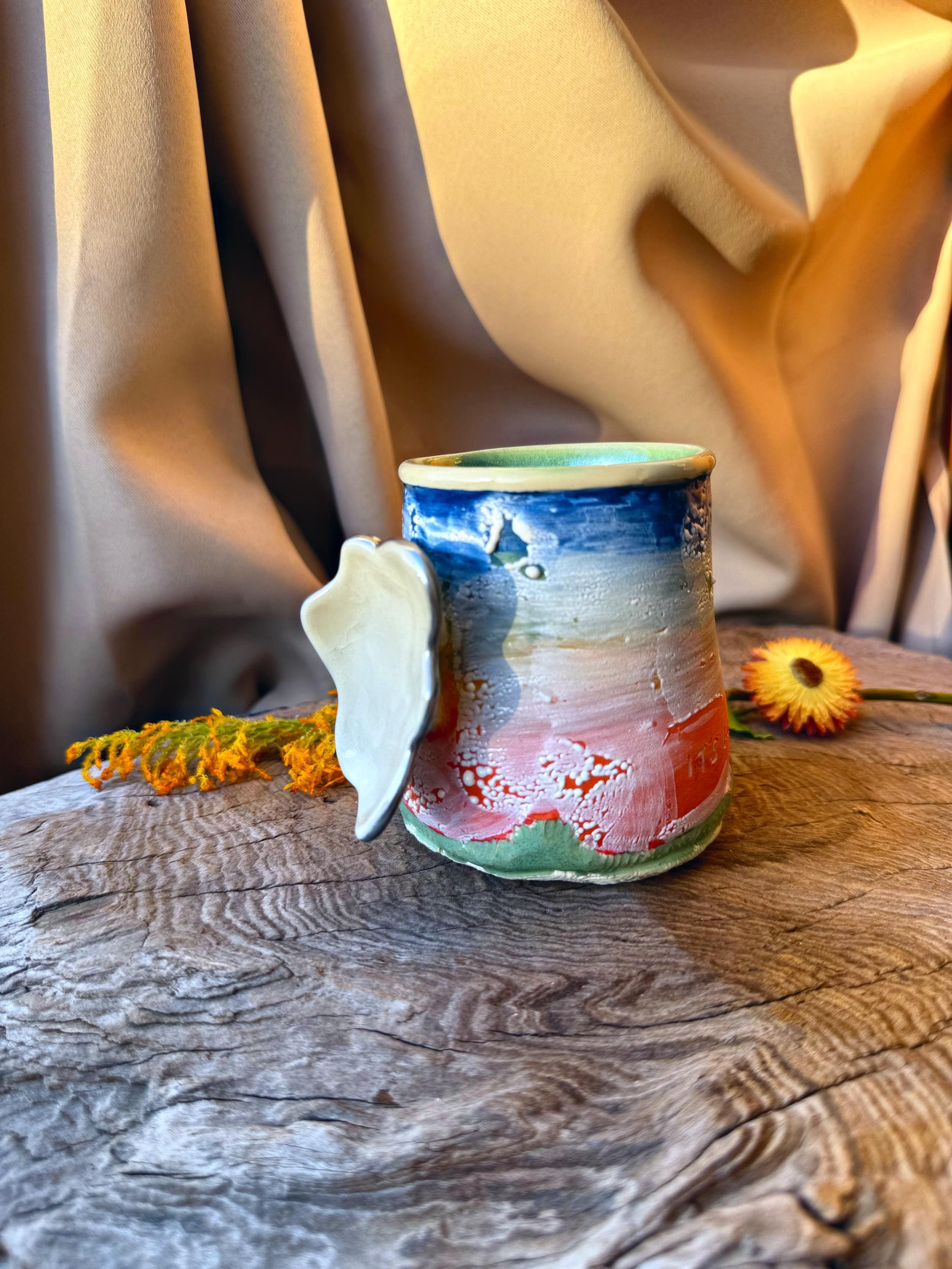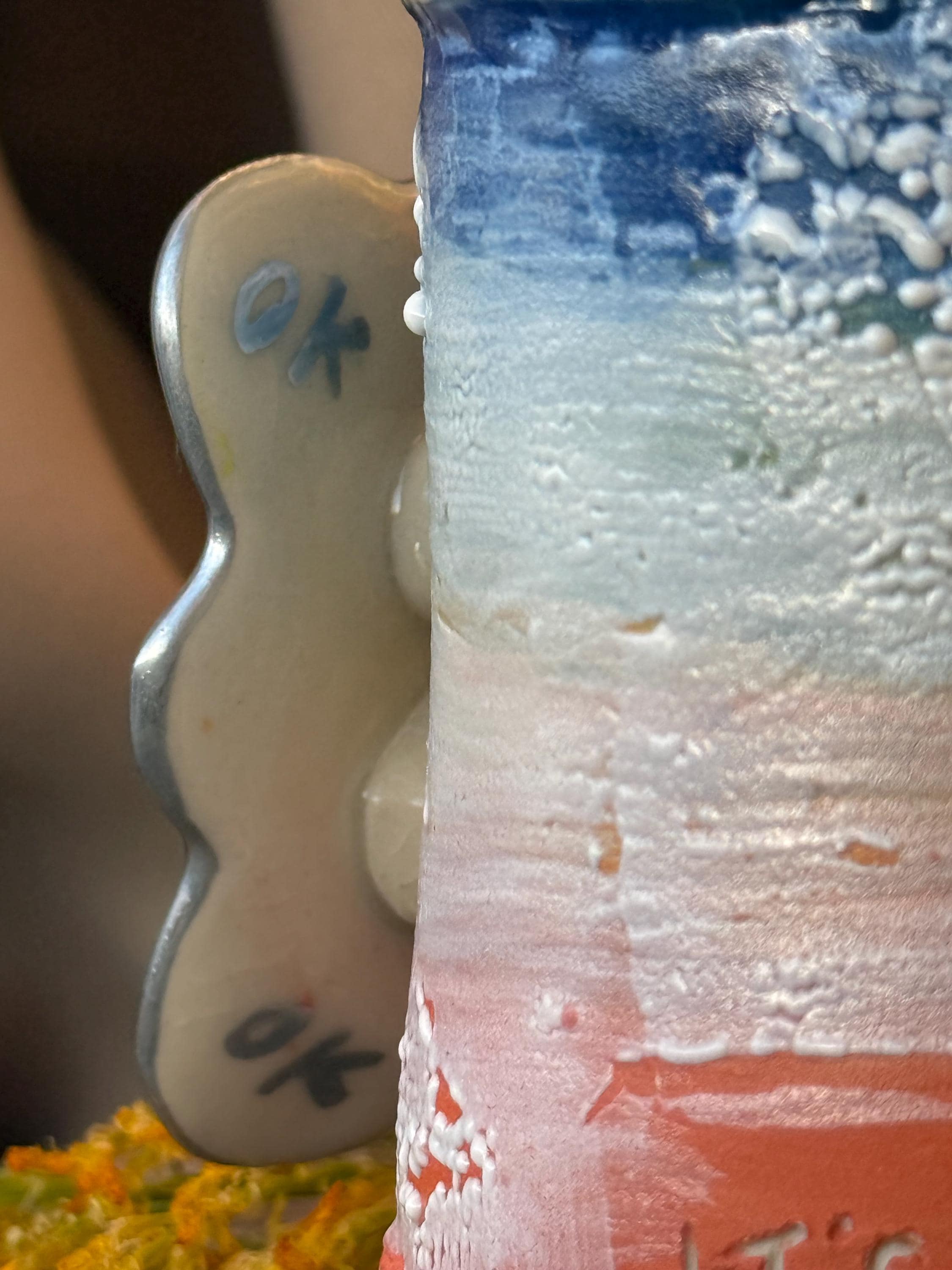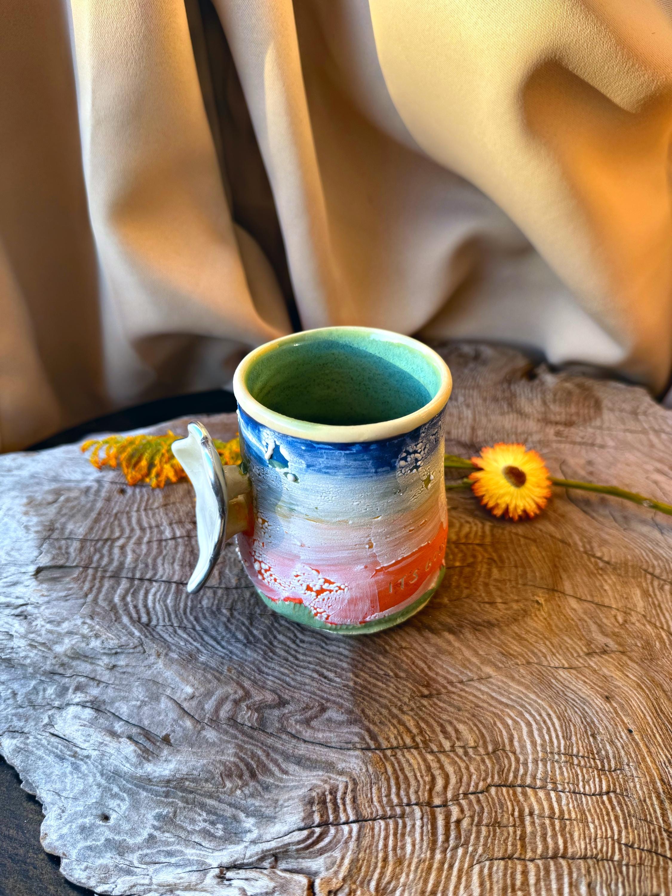 It's Going To Be Ok. Rainbow underglazes and Ritual Glaze in white, a cloud-shaped handle with slight curves on curves, and chrome edges/silver lining. "Ok" is also found a couple of times behind the cloud for assurance. Do not use in microwave, handwash with a soft cloth or sponge gently to retain chrome. Measures 3"x4". Porcelain cone 6. Wheel-thrown.